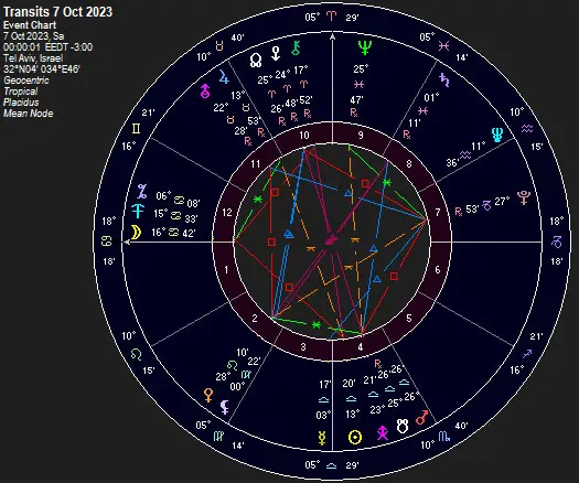 Am Beispiel des Angriffes auf Israel kann man die Archetypen von Mars und Eris in unmissverständlicher Aktion erleben. Das Tageshoroskop vom 07.10.2023 zeigt beide an den Mondknoten...